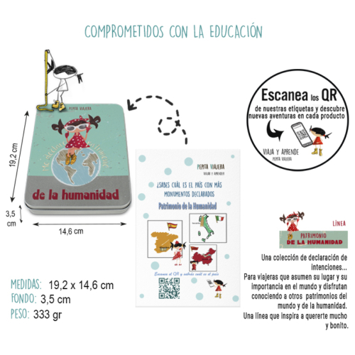 Ταξιδέψτε και μάθετε με την Pepita Viajera σαρώνοντας τον κωδικό QR που συνοδεύει κάθε αντικείμενο και ανακαλύψτε τον κόσμο μαζί της.