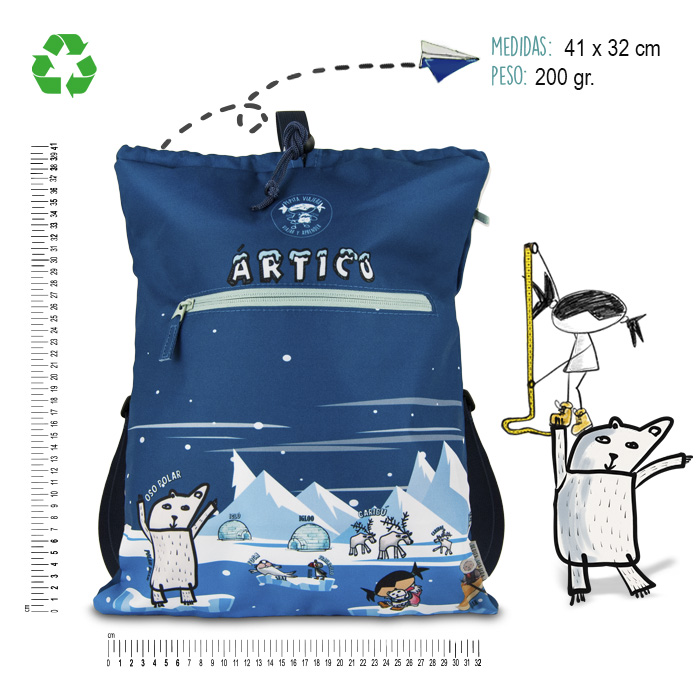 Αυτό το σακίδιο είναι γεμάτο με εκπαιδευτικές πληροφορίες για την Αρκτική και τον Βόρειο Πόλο. Κατασκευασμένο με Rpet. Οι επίπεδοι ιμάντες παρέχουν μια άνετη χρήση χωρίς ενόχληση στους ώμους, ακόμη και κατά τη διάρκεια μεγάλων περιπάτων ή εξερευνήσεων. Το μέγεθός του είναι ιδανικό για να μεταφέρετε όλα τα βασικά αντικείμενα και το βάρος του το καθιστά εύκολο στη μεταφορά του.