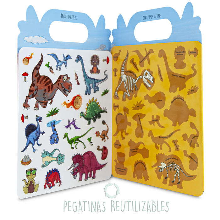 Τα παιδιά μπορούν να κολλήσουν και να ξεκολλήσουν τα αυτοκόλλητα των δεινοσαύρων όσες φορές θέλουν, επιτρέποντάς τους να δημιουργήσουν ατελείωτους συνδυασμούς και σενάρια για τις ιστορίες τους. Τα αυτοκόλλητα απεικονίζουν μια ποικιλία δεινοσαύρων.