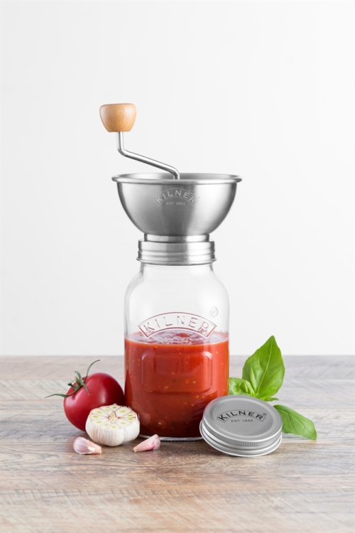Το Σετ παρασκευής σάλτσας σας βοηθά να δημιουργήσετε φρέσκες, σπιτικές σάλτσες ζυμαρικών, πουρέ και παιδικές τροφές. Απλώς γεμίστε τη χοάνη με τα επιθυμητά συστατικά και γυρίστε τη λαβή για να κάνετε πουρέ τα συστατικά απευθείας στο βάζο. Περιλαμβάνεται χωνί από ανοξείδωτο ατσάλι που βιδώνει απευθείας στο βάζο και ένα καπάκι που το καθιστά ιδανικό για αποθήκευση στο ψυγείο.
