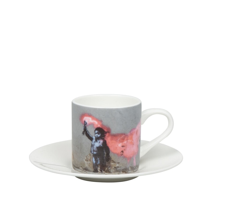 Στο πιατάκι του φλυτζανιού μπορείτε να βρείτε έναν κωδικό QR που θα σας επιτρέψει να έχετε πρόσβαση σε αποκλειστικό ψηφιακό περιεχόμενο για τον Banksy και την τέχνη του, απολαμβάνοντας ταυτόχρονα τον καφέ σας.
