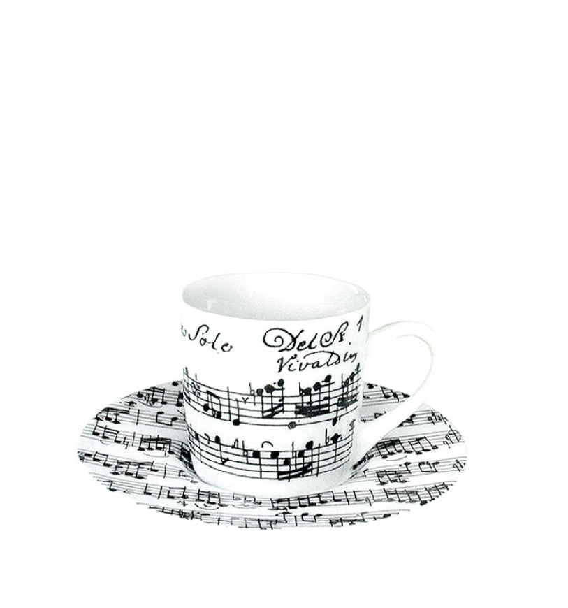 Κομψές μαύρες νότες χορεύουν ζωντανεύοντας τη μελωδία της σονάτας του Βιβάλντι πάνω στην καλύτερη πορσελάνη. Κάθε κομμάτι είναι ένα χειροποίητο έργο τέχνης, που συνδυάζει τέλεια το πάθος για τη μουσική και τον καφέ. Απολαύστε την απαράμιλλη γεύση του εσπρέσο σας από τα εκλεκτά φλιτζάνια μας, που όχι μόνο γοητεύουν το βλέμμα αλλά και αιχμαλωτίζουν τις αισθήσεις. Αυτό το φλυτζάνι είναι σύμβολο της αγάπης σας για τη μουσική και τον καφέ.