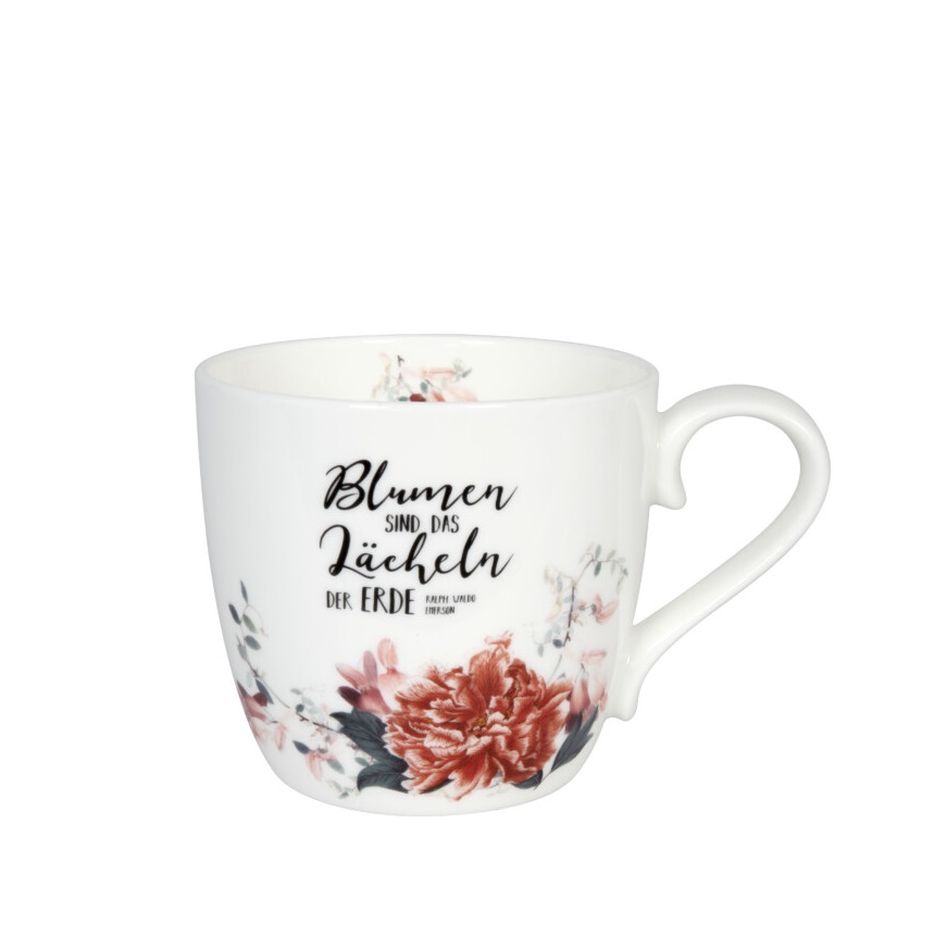 Ένας υπέροχος και ανθισμένος κήπος απεικονίζεται σε αυτήν την πορσελάνινη κούπα Könitz και τη στολίζουν τα φρέσκα λουλούδια και τα πέταλά τους. Στην κούπα αναγράφεται το μήνυμα «Τα λουλούδια είναι ο ήχος της γης». Η επιλογή των κόκκινων λουλουδιών κάνει επίσης αυτή την κούπα ένα υπέροχο δώρο για κάθε ρομαντική περίσταση.