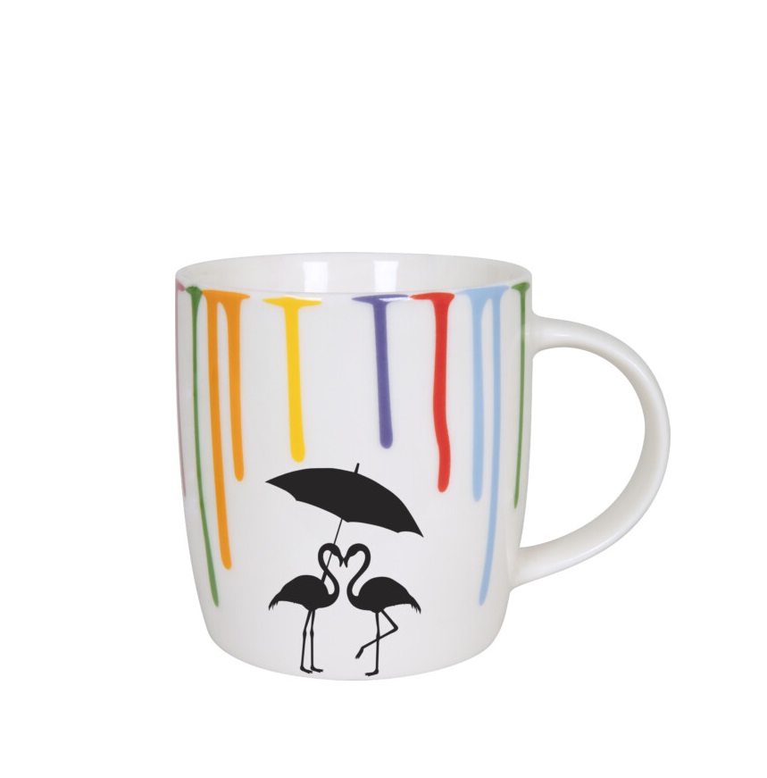 Δύο υπέροχα φλαμίνγκο κάτω από μια μαύρη ομπρέλα με πολύχρωμη βροχή στα έντονα χρώματα του ουράνιου τόξου, απεικονίζονται σε αυτήν την κούπα. Ένα υπέροχο δώρο σε ένα αγαπημένο σας πρόσωπο.