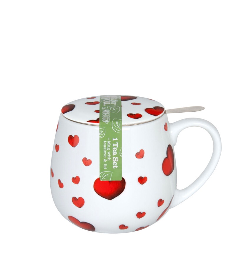 Αυτή η κούπα έχει μοτίβο λαμπερές κόκκινες καρδιές σε ρετρό στυλ που αναδύονται στο λευκό φόντο. Διαθέτει φίλτρο και ασορτί καπάκι και είναι ιδιαίτερα κατάλληλη για ένα ζεστό τσάι τις κρύες μέρες. Λόγω του στρογγυλού σχήματός της, εφαρμόζει όμορφα στο χέρι σας.