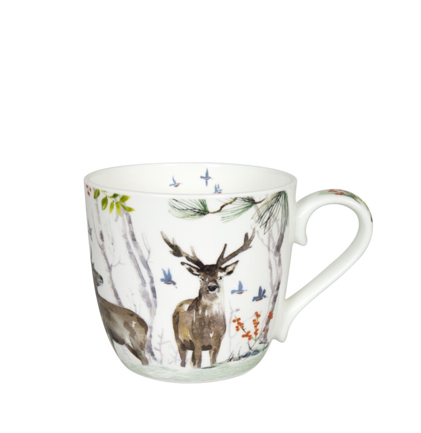 Όταν οι μέρες μικραίνουν και κάνει κρύο έξω, μας αρέσει να καθόμαστε μέσα και να απολαμβάνουμε ένα ζεστό τσάι, καφέ ή κακάο με αυτήν την κούπα στην οποία επικρατεί μια σκηνή στο δάσος με ελάφια, δέντρα, μούρα, πουλιά και θάμνους μια χειμωνιάτικη μέρα.