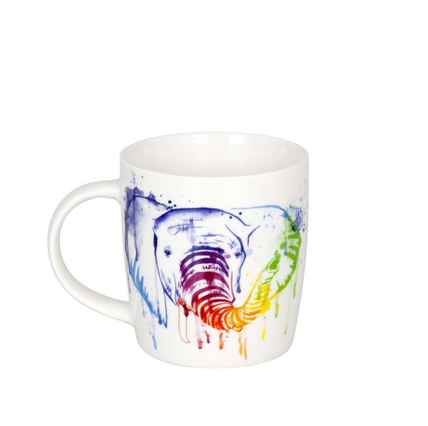 Ο ελέφαντας σε αυτήν την κούπα παρουσιάζεται σε όλα τα χρώματα του ουράνιου τόξου. Ο ευγενικός γίγαντας είναι ζωγραφισμένος σε ένα πορτρέτο σε ακουαρέλα. Το χρώμα που τρέχει κάνει το ζώο να ζωντανεύει με δημιουργικό τρόπο.